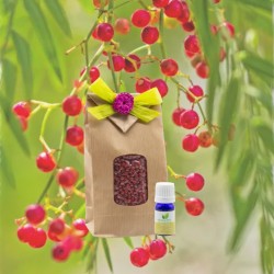 Arbre connue en Amérique du Sud pour ses vertus , l'huile essentielle des Baies roses porte une forte teneur de Monoterpènes (tonique et antalgique). Son parfum est à la fois frais comme le poivre mais aussi doux et fruité.